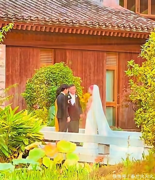 刘岁的女儿刘一丝还跟小时候一样,小叛逆有个性,办婚礼染了一头粉色头发,现场打扮得很精致,穿着一身金色抹胸裙在户外和新郎拍照。